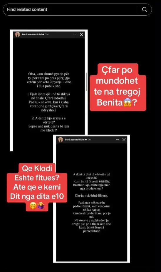 “Olsa, kam shumë pyetje për ty… Fjala ishte që unë të shkoja në finale. Çfarë ndodhi? Pse nuk shkova, kur i kisha votat dhe gjithçka? Çfarë ndryshoi?”, shkruante Benita, duke lënë të kuptohet se finalja i ishte premtuar.