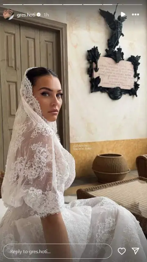 Në imazhet që kanë bërë xhiron e internetit, Gresa duket mahnitëse me fustanin e bardhë dhe vello elegante, duke ngjallur pyetje të shumta tek ndjekësit e saj.
