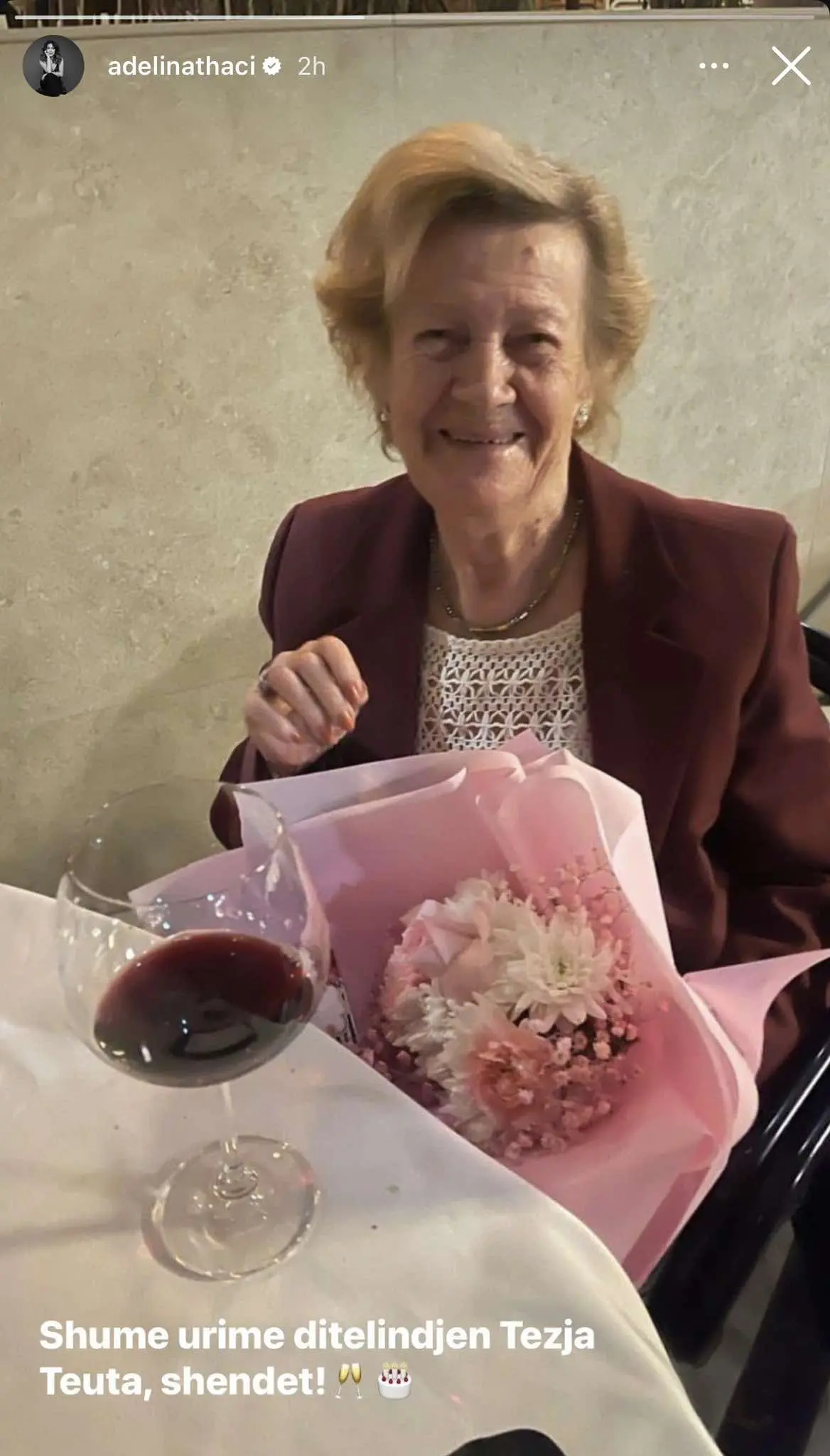 Krahas fotos, Adelina ka shkruar disa fjalë urimi, duke i dëshiruar vjehrrës shëndet të plotë dhe një ditëlindje të gëzuar.