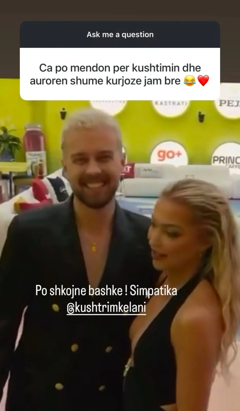 Ajo ka ripostuar një moment të afërsisë mes Kushtrim dhe Aurorës, duke shkruar: “Po shkojnë bashkë! Simpatika!” Kjo tregon se ajo nuk ndjen asnjë xhelozi apo hatërmbetje për lidhjen e tyre.