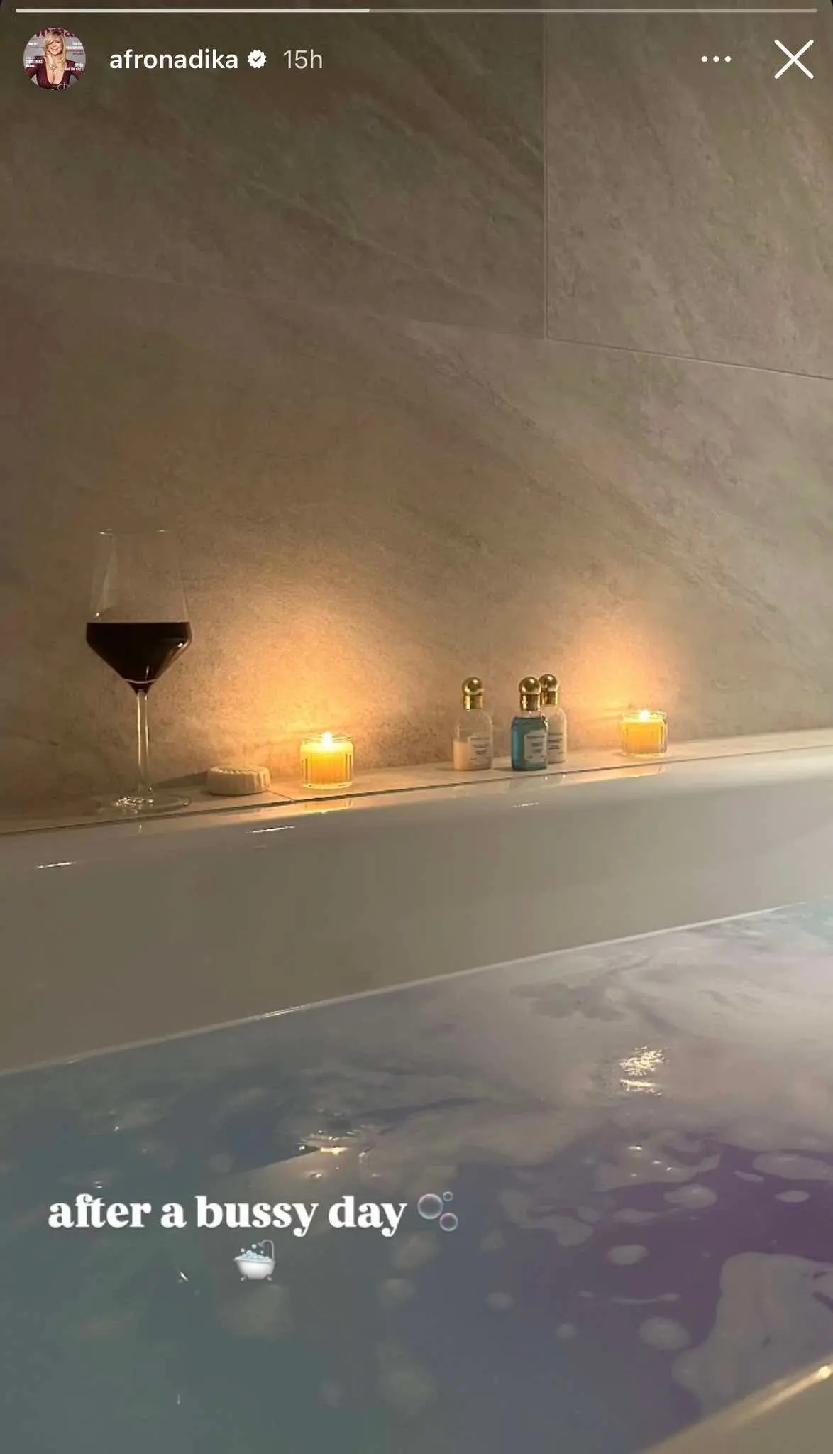 Pas këtij njoftimi emocionues, ajo ka ndarë një fotografi të veçantë nga një moment relaksi në vaskë, ku atmosfera e qetë dhe romantike është theksuar nga verë dhe qirinj, duke sugjeruar praninë e partnerit të saj.