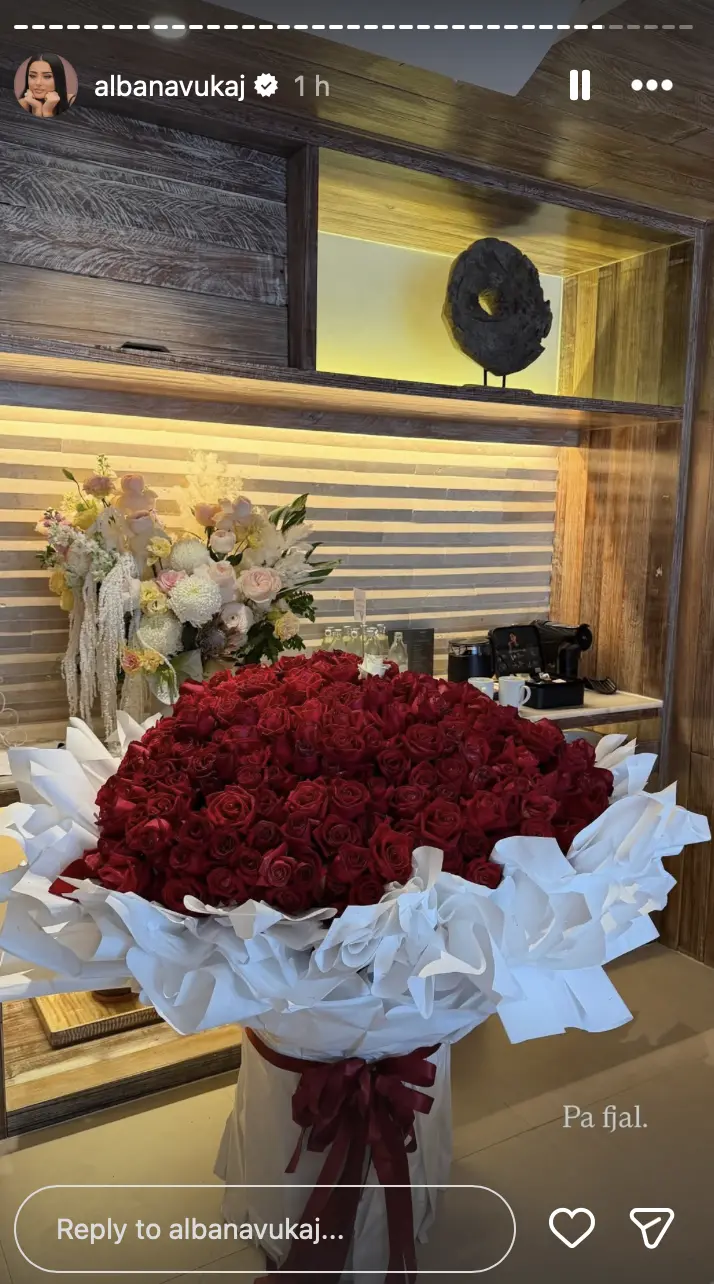 Një buqetë gjigante me qindra trëndafila të kuq ka tërhequr vëmendjen e të gjithëve. Alba e ka përshkruar këtë dhuratë të veçantë me fjalët “Pa fjalë”, duke shprehur emocionet e saj për këtë moment të paharrueshëm.