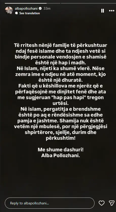 Pas një deklarate të fortë në “Big Brother VIP Kosova”, ku Alba Pollozhani njoftoi se kishte vendosur të mbulohej sipas ritualeve muslimane, ajo ka ndarë me publikun detaje të rëndësishme rreth këtij vendimi të saj.