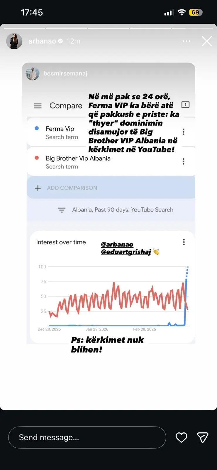 Një postim i fundit nga Arbana Osmani në Instagram ka ndezur diskutime të shumta, ku ajo ndau një grafik të Google Trends që tregon se “Ferma VIP” ka arritur të kalojë rivalin e saj në kërkimet në YouTube. Kjo ka sjellë një valë reagimesh nga ndjekësit dhe analistët e mediave.