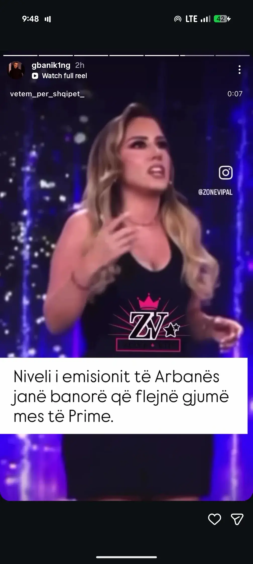 Përmes një postimi në llogarinë e tij në Instagram, G Bani ka ndarë një story me një video të Arbanës dhe e ka shoqëruar me një fjali ironizuese: “Niveli i emisionit të Arbanës janë banorë që flejnë gjumë mes të Prime.”