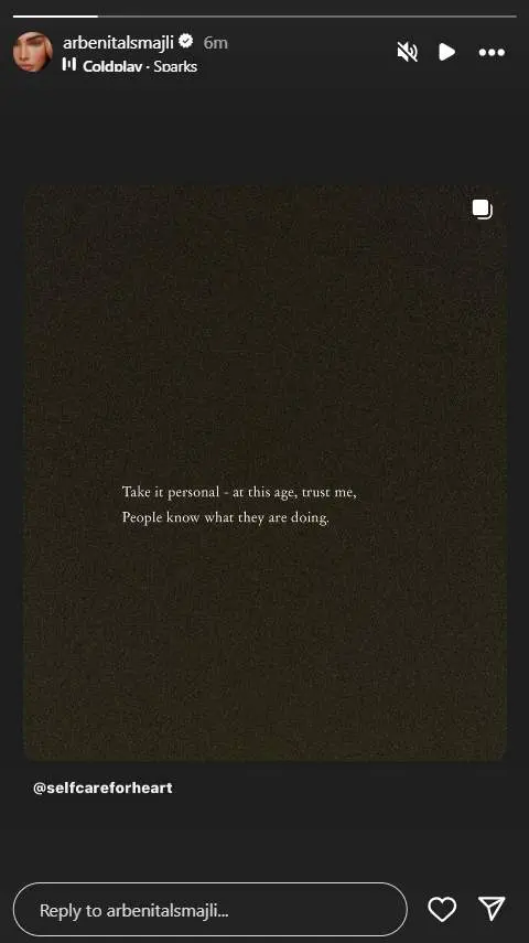 Një nga postimet më të fundit të saj në InstaStory përmbante një thënie intriguese: “Merre personale, në këtë moshë, beso, njerëzit e dinë mirë çfarë po bëjnë”. Kjo frazë ka shkaktuar një valë reagimesh, duke e lidhur atë me situata të mundshme në jetën e saj personale, veçanërisht pas ndarjes nga reperi Fero.