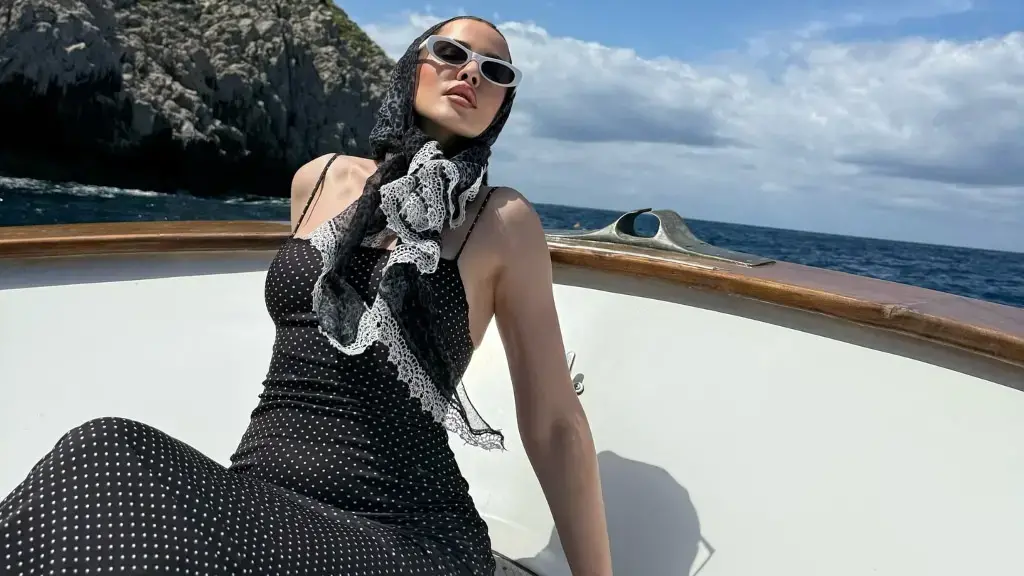 E veshur me një fustan të bardhë me pika të zeza dhe një shami elegantë, ajo shfaqet në një anije, duke i dhënë një ndjesi luksoze eksperiencës së saj. Ambienti përreth saj, me detin dhe shkëmbinjtë në sfond, e bën këtë foto të duket si një skenë nga një film.