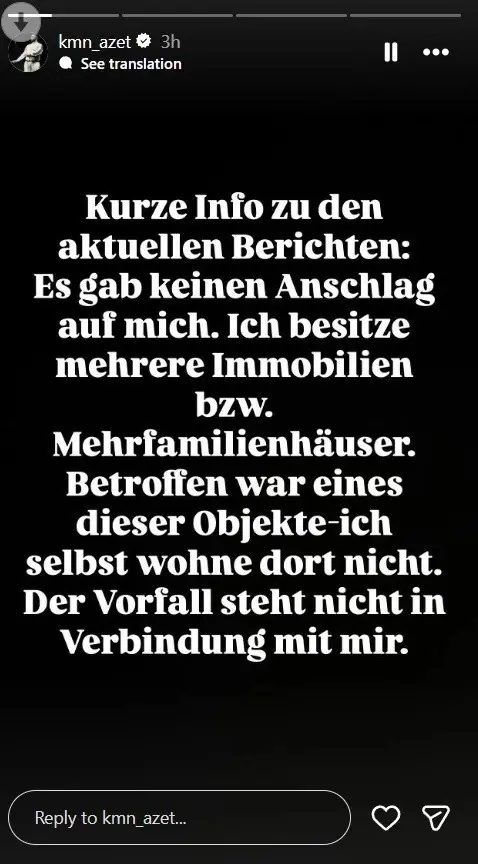 Pas raportimeve, Azet vendosi të reagojë përmes një postimi në Instagram, ku sqaroi situatën dhe hodhi poshtë çdo spekulim mbi një atentat ndaj tij.