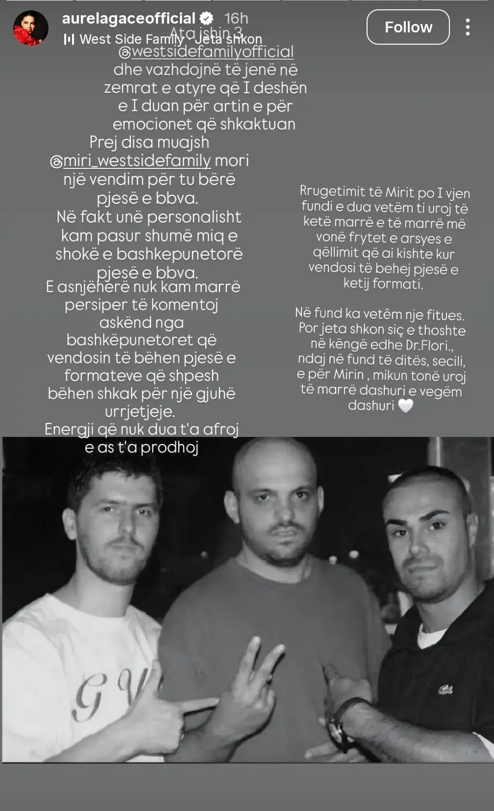Ajo e përmend “West Side Family” dhe Dr. Florin, duke rikthyer në vëmendje historinë e tyre dhe ndikimin që ata kanë pasur në jetën e saj dhe të Mirit. Kjo tregon se lidhjet e vjetra janë ende të forta dhe mbështetëse.