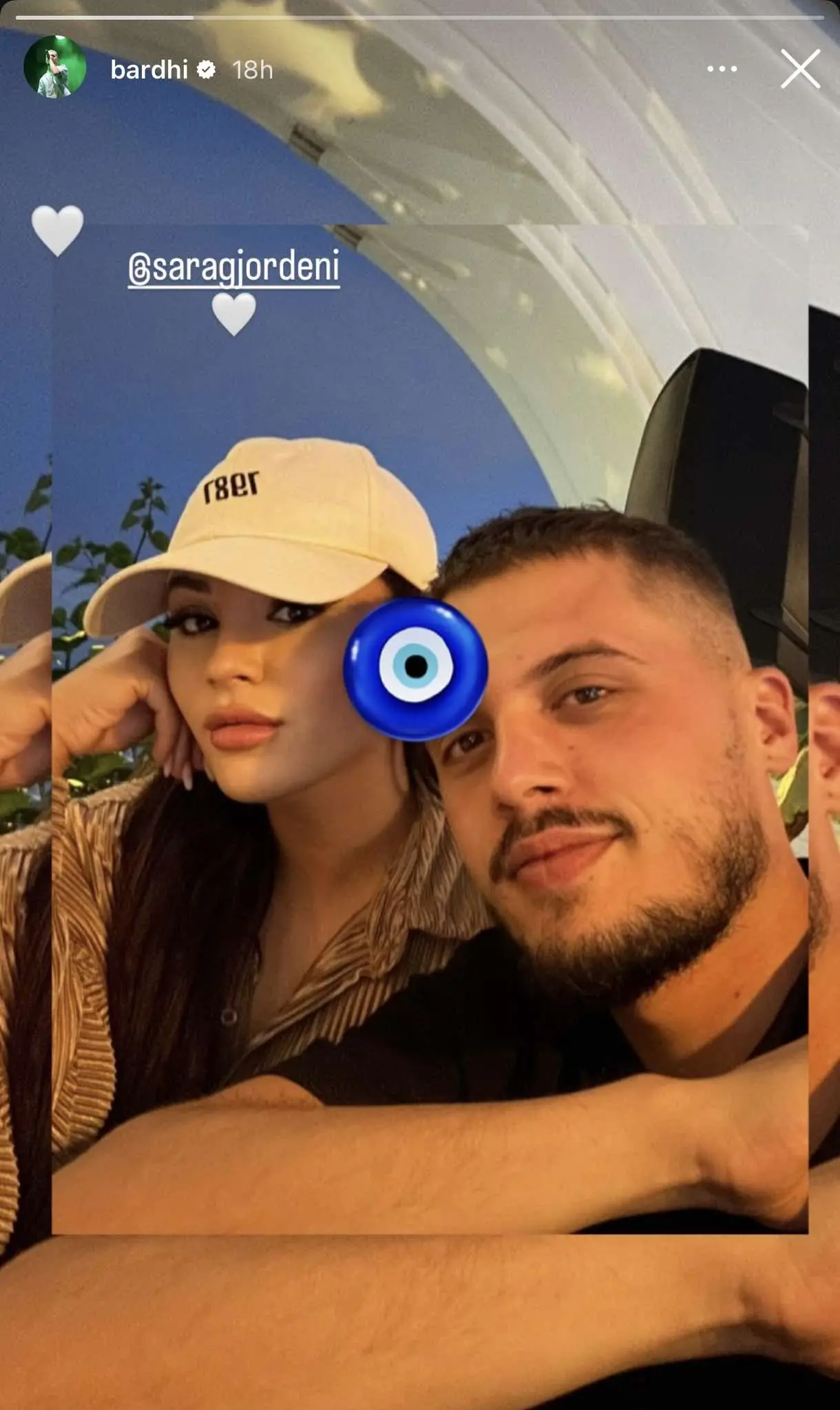 Në imazh, çifti shfaqet i buzëqeshur dhe i lumtur, duke reflektuar një moment të veçantë në jetën e tyre. Bardhi ka vendosur një simbol të syrit blu, i njohur si mbrojtje kundër syrit të keq, duke e shoqëruar me një përshkrim të thjeshtë, por domethënës.