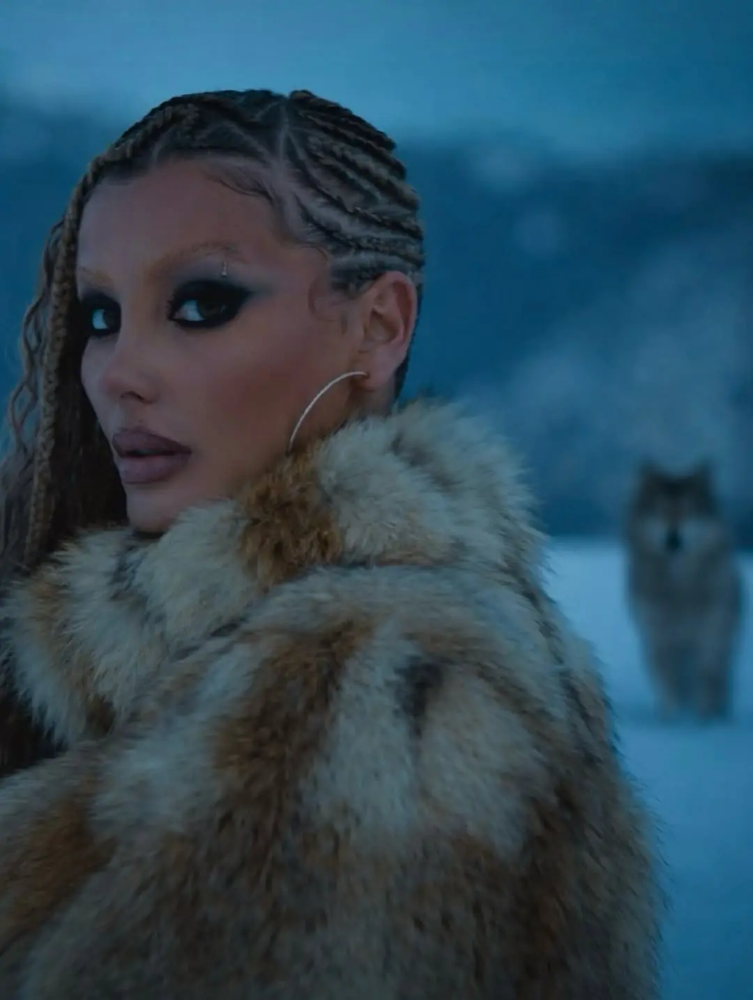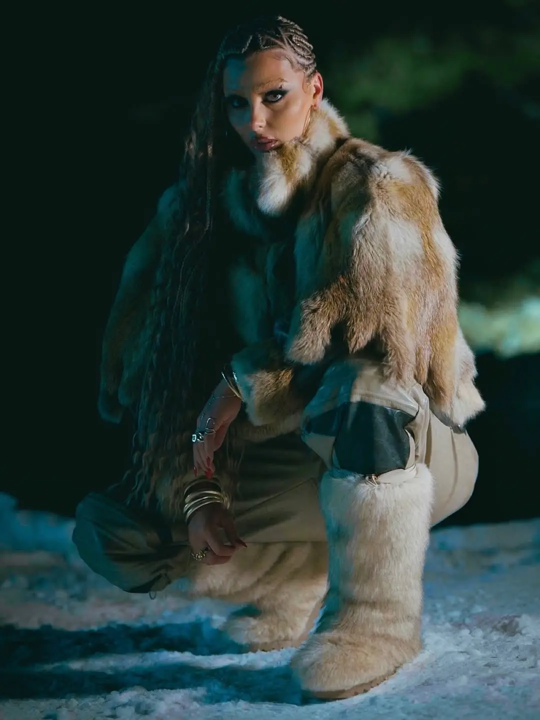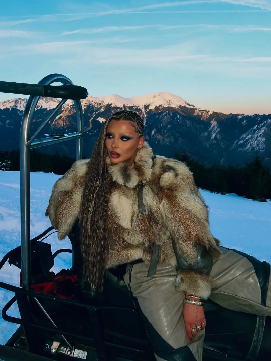 Me një stil misterioz dhe elegant, ajo paraqitet me një mantel prej gëzofi, duke e theksuar më tej personalitetin e saj unik.