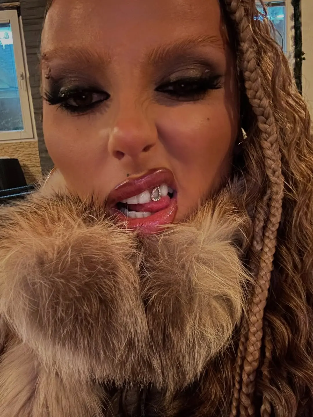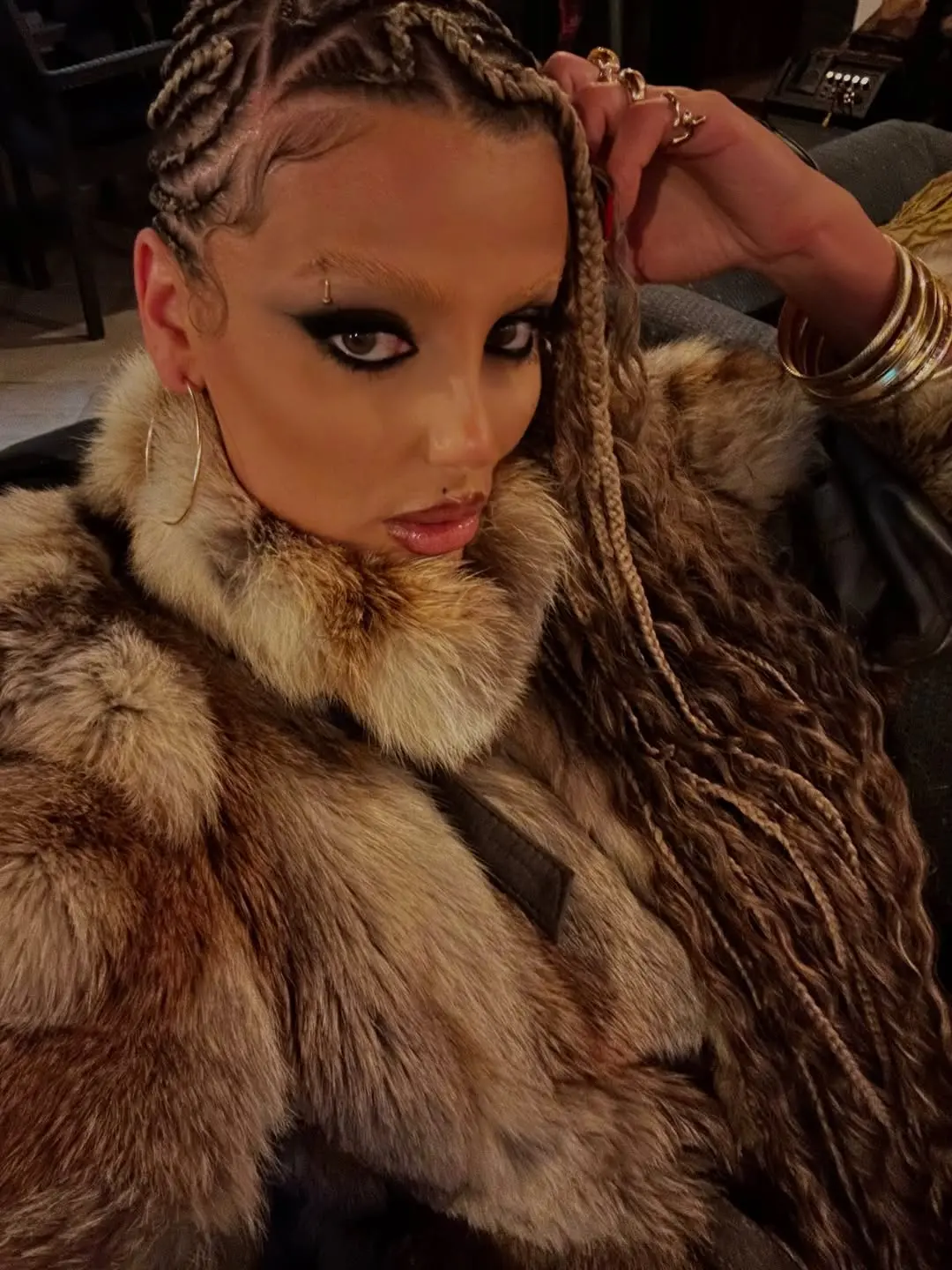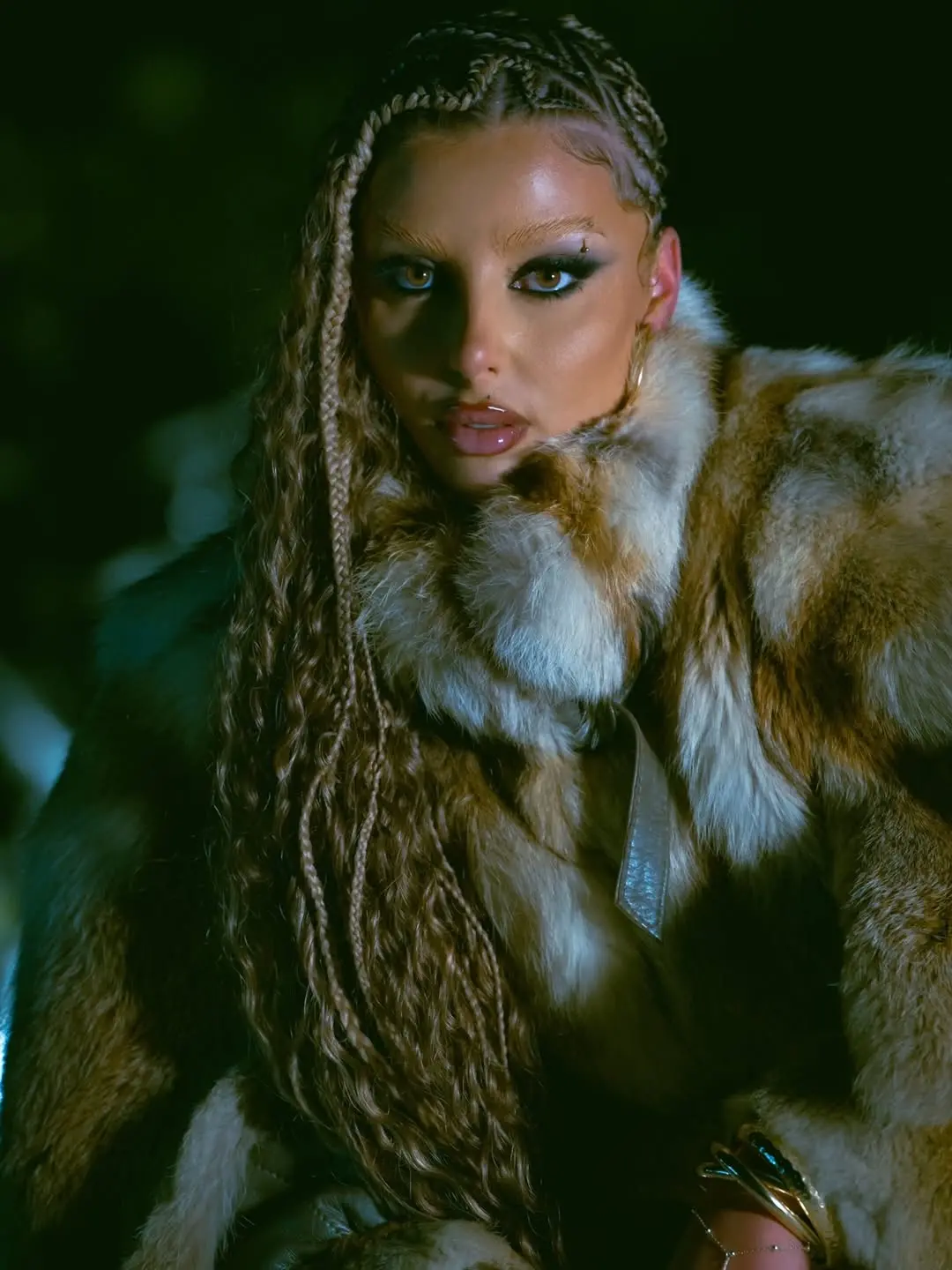 Me një stil misterioz dhe elegant, ajo paraqitet me një mantel prej gëzofi, duke e theksuar më tej personalitetin e saj unik.