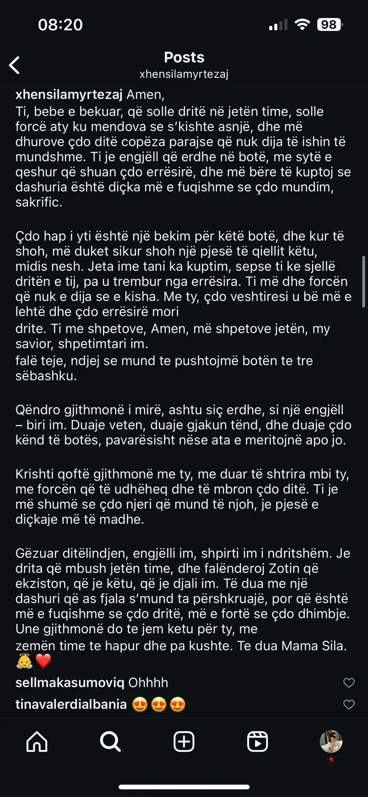 “Çdo hap i yti është një bekim për këtë botë,” shkruan Xhensila, duke theksuar se djalin e saj e sheh si një pjesë të qiellit.