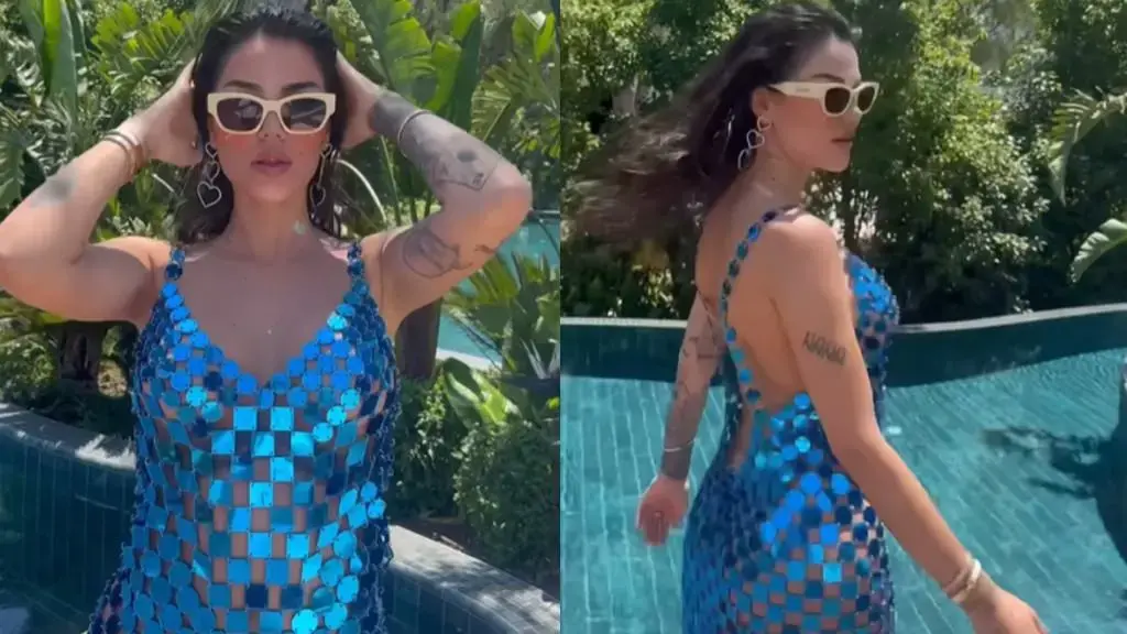 Ajo shfaqet me një fustan blu shkëlqyes, syze dielli të markës Celine si dhe ka vënë aksesorë të shumtë.