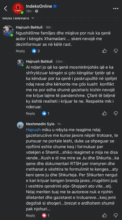 “Ngushëllime familjes dhe miqve, por nuk ka qenë autor i këngës Xhamadani… skeni nevojë me dezinformuar as në këtë rast,” shkruan Behluli, duke e bërë të qartë që ai nuk do të lejojë që historia të ndryshohet pas vdekjes së Shemit.