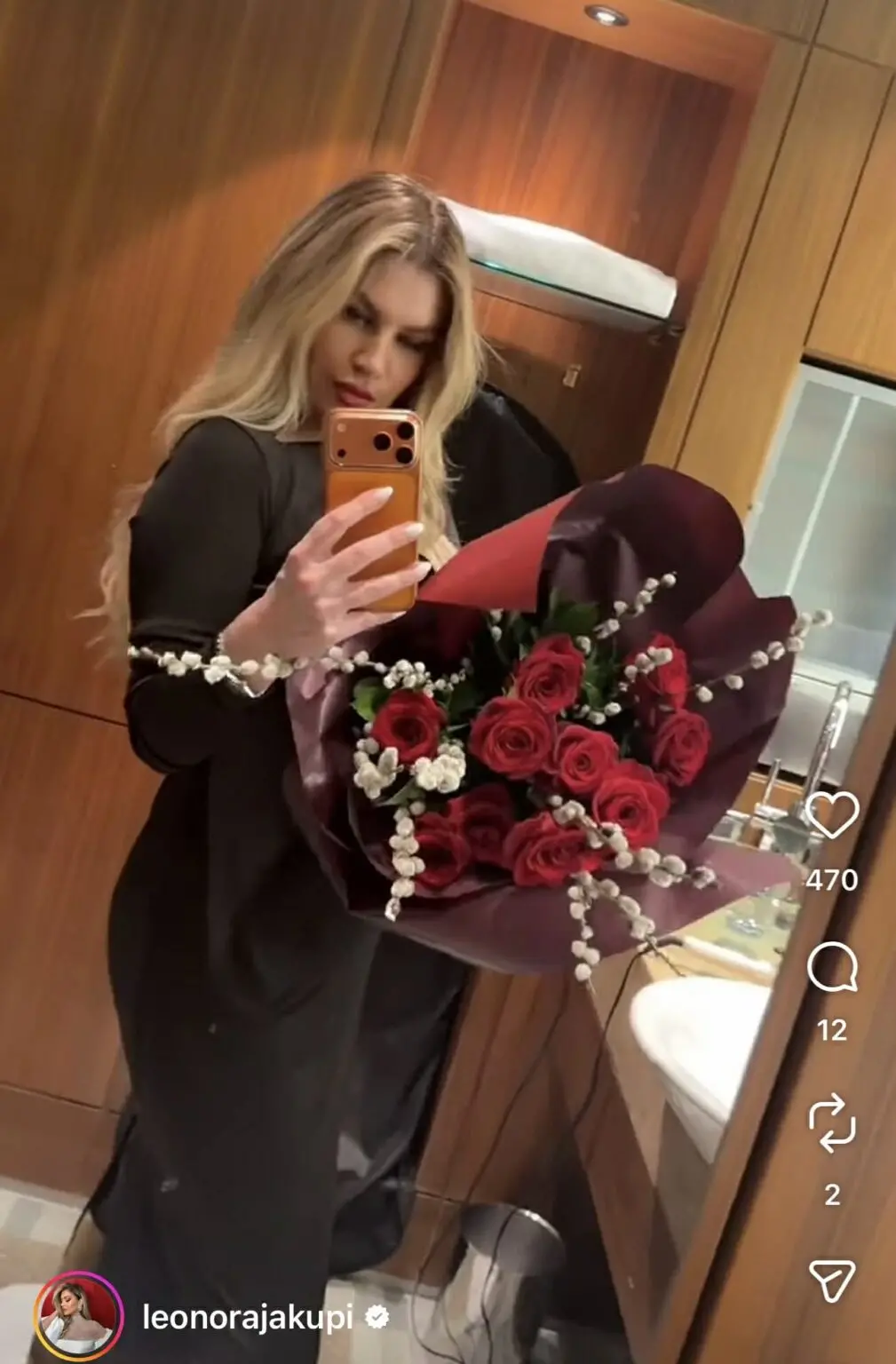 Me një buzëqeshje të madhe në fytyrë, Leonora ka pozuar me buqetën e saj, duke shfaqur një pamje të lumtur dhe energjike. Kjo ngjarje ka bërë që fansat e saj të shprehin urimet e tyre në rrjetet sociale, duke e bërë atë të ndihet e veçantë.