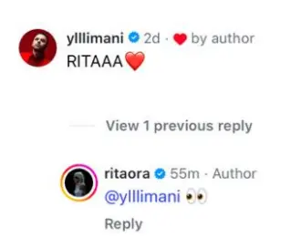 Shkëmbimi i fundit i komenteve mes Ritës dhe Yllit ka shtuar edhe më shumë dyshimet për një afrimi artistik. Komenti i Yllit “RITAAA ” nën postimin e Ritës, i shoqëruar me reagimin e saj “ylllimani “, ka bërë që ndjekësit të shpërthejnë me teori dhe aludime për një projekt të përbashkët.