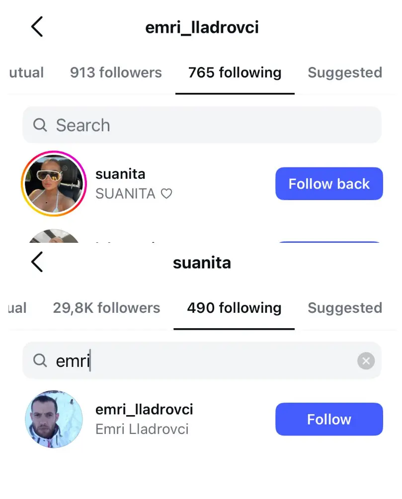 Suanita dhe ish i fejuari i saj ende ndjekin njëri-tjetrin në rrjete sociale, duke shtuar kureshtjen e publikut.