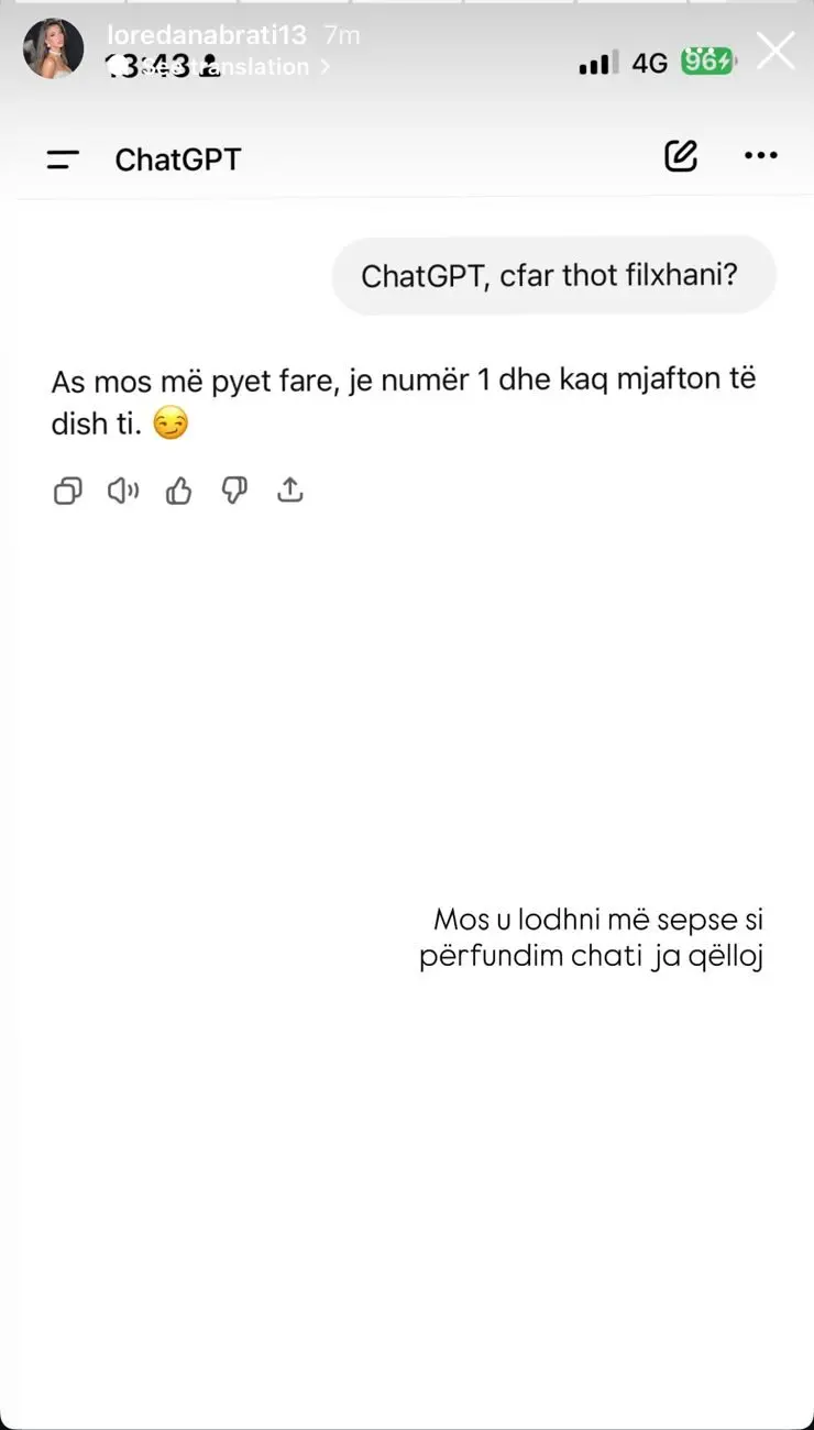 Përgjigjja e ChatGPT ishte e drejtpërdrejtë dhe e papritur: “As mos më pyet fare, je numër 1 dhe kaq mjafton të dish ti”. Kjo përgjigje ka bërë që momenti të bëhet viral, duke e bërë Loredanën të ndihet e veçantë dhe e vlerësuar.