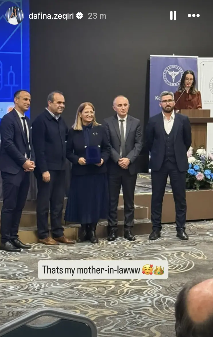 Një nga fotot e postuara tregon vjehrrën e Dafinës duke mbajtur në duar çmimin, ndërsa Dafina ka shkruar me emocion: “Kjo është vjehrra ime!”.