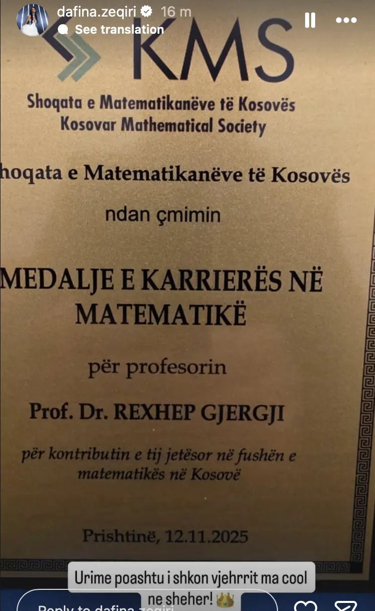 Nderimi për vjehrrin e Dafinës, Prof. Dr. Rexhep Gjergji, është bërë nga Shoqata e Matematikanëve të Kosovës (KMS), e cila i dha atij çmimin “Medalja e Karrierës në Matematikë”.