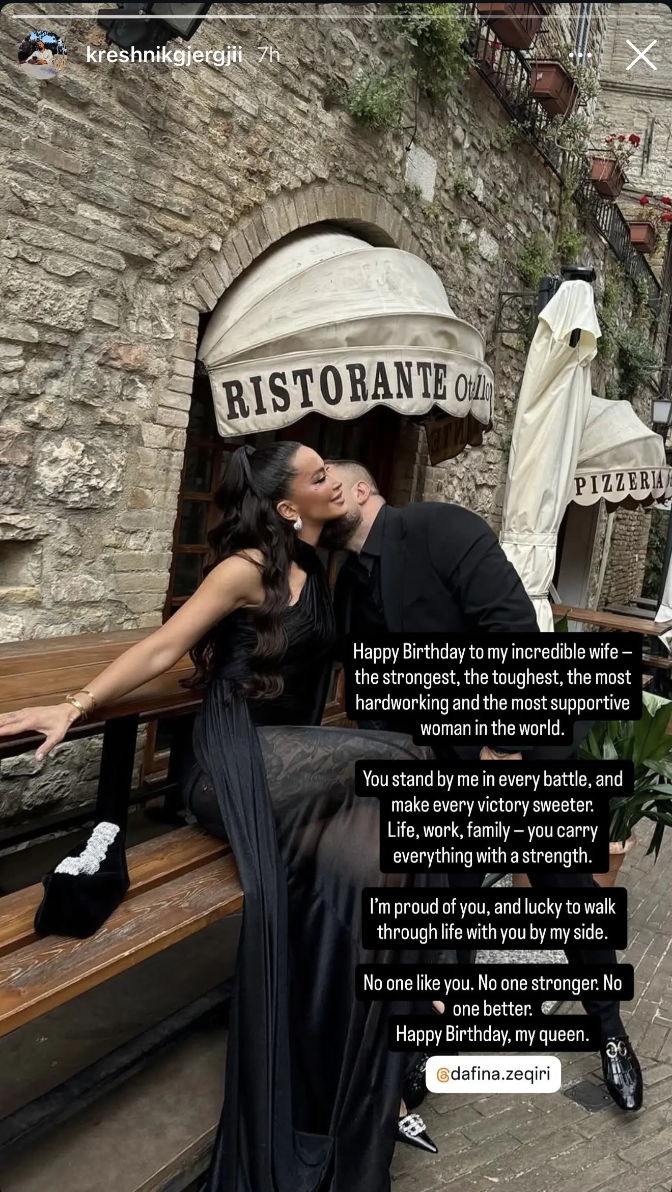 “Gëzuar ditëlindjen gruas sime të jashtëzakonshme – më e fortë, më punëtore dhe më mbështetëse në botë. Ti qëndron pranë meje në çdo betejë dhe e bën çdo fitore më të ëmbël,” ka shkruar Kreshniku, duke shprehur dashurinë dhe mirënjohjen për Dafinën.