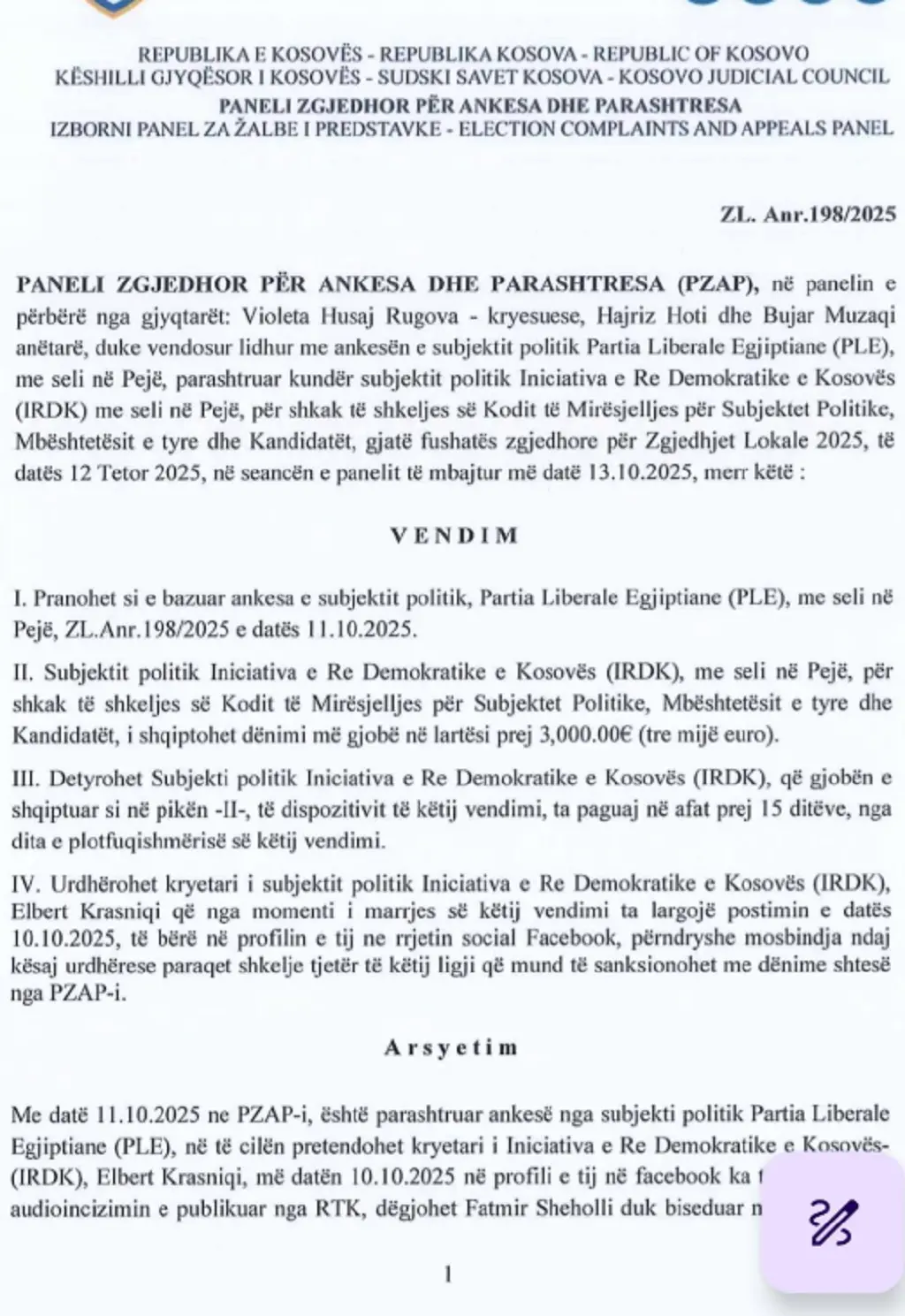 Paneli Zgjedhor për Ankesa dhe Parashtresa (PZAP) gjobitur me 3,000 euro subjektin politik Iniciativa e Re Demokratike e Kosovës (IRDK) dhe kryetarin e saj, ministrin Elbert Krasniqi, për shkelje të Kodit të Mirësjelljes gjatë fushatës për Zgjedhjet Lokale 2025.