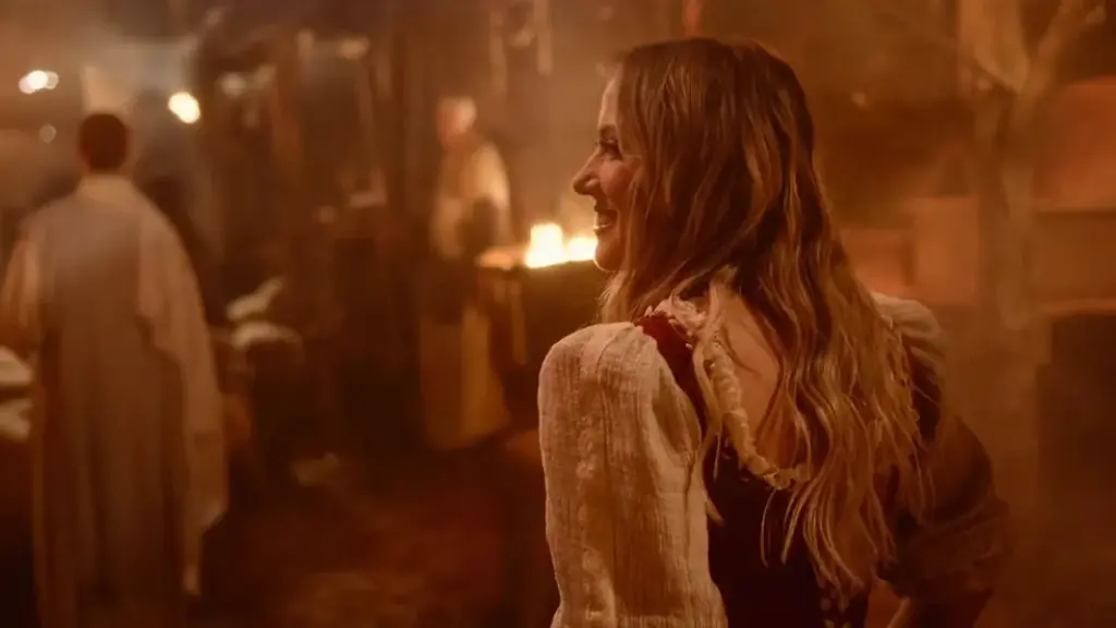 Pamjet tregojnë një ambient që duket si një shesh xhirimi historik ose një fshat i vërtetë i izoluar. Shihen figurantë të veshur me kostume tradicionale/mesjetare, duke punuar, duke shitur perime në tezga druri dhe duke u kujdesur për kafshët në një ambient plotësisht rustik.