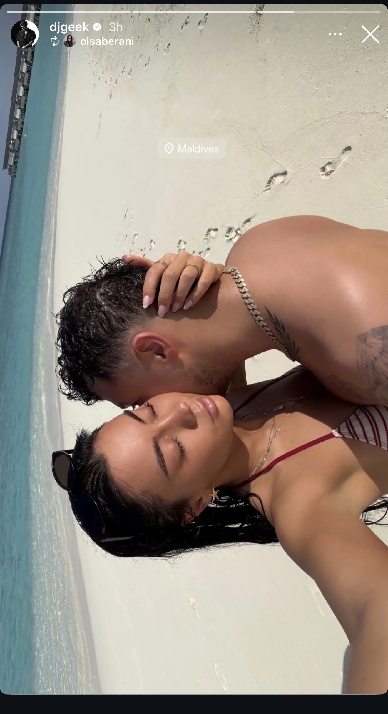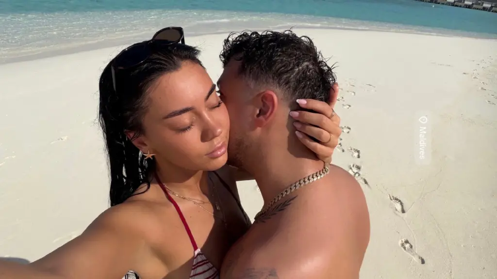 Ujërat e kristal të Maldiveve ofrojnë një sfond perfekt për dashurinë e tyre, duke i bërë ata të duken si një çift nga një film romantik.