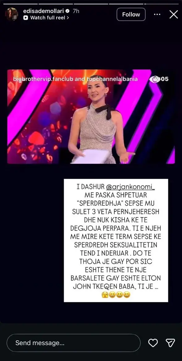 Në një shkrim të publikuar në Instagram Story, Edisa ka përdorur tone ironike dhe akuza personale ndaj opinionistit.