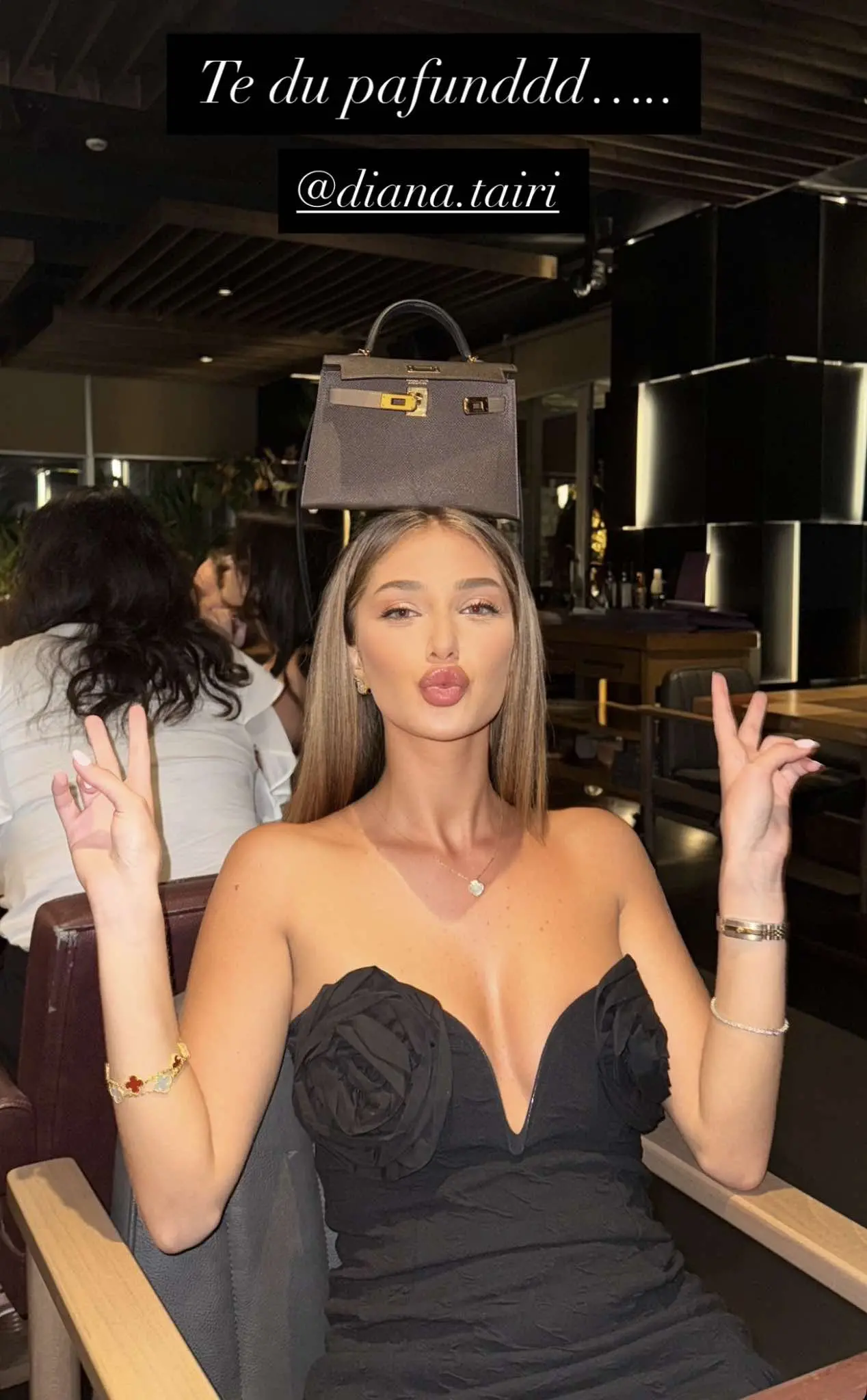 Fotografia e publikuar nga Adelina e tregon Dianën në një stil unik, ku ajo mban një çantë luksoze mbi kokë, një detaj që e bën atë të duket jashtëzakonisht interesante. Ky moment ka shkaktuar një valë reagimesh dhe komentesh nga ndjekësit e saj.