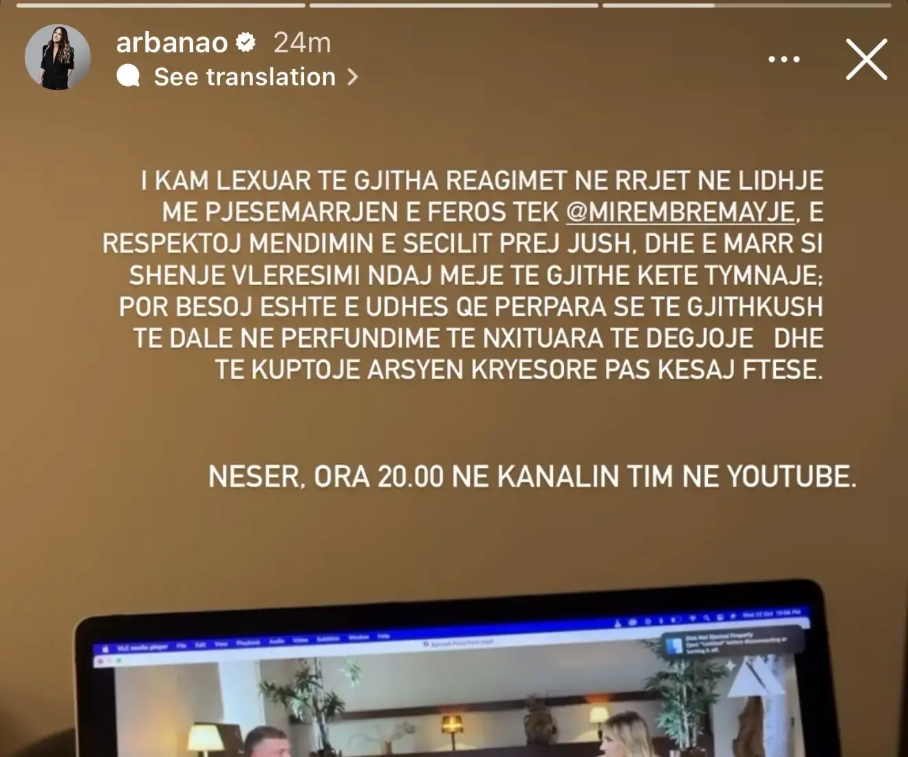 “I kam lexuar të gjitha reagimet në rrjet në lidhje me pjesëmarrjen e Feros tek @mirembremajuve. E respektoj mendimin e secilit prej jush, dhe e marr si shenjë vlerësimi ndaj meje të gjithë këtë tymnajë,”- shkruan Arbana në postimin e saj.