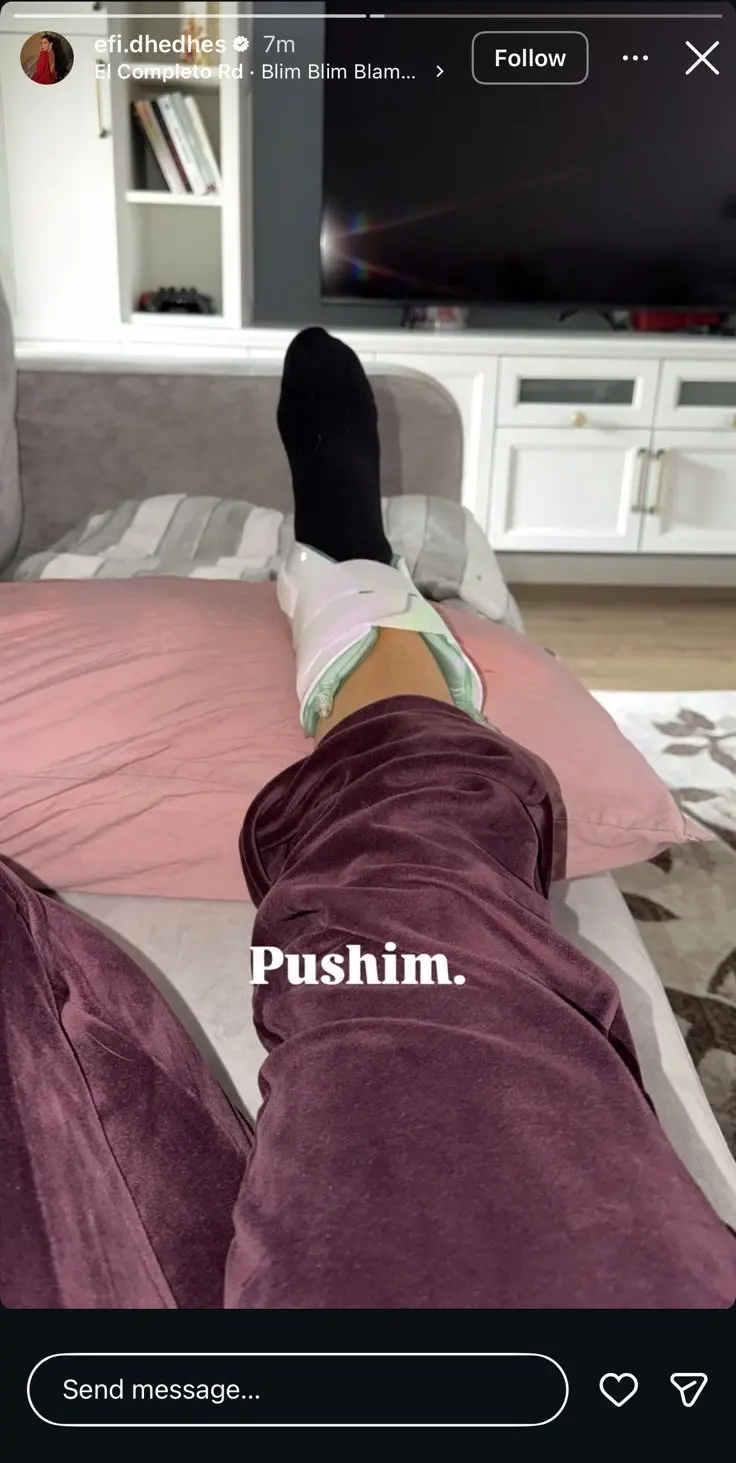 Fotografia e publikuar në Story është e veçantë, pasi vëmendjen kryesore e merr këmba e saj e fashuar. Kjo situatë ka ngjallur pyetje dhe shqetësim te ndjekësit, të cilët janë të interesuar për shëndetin e saj.