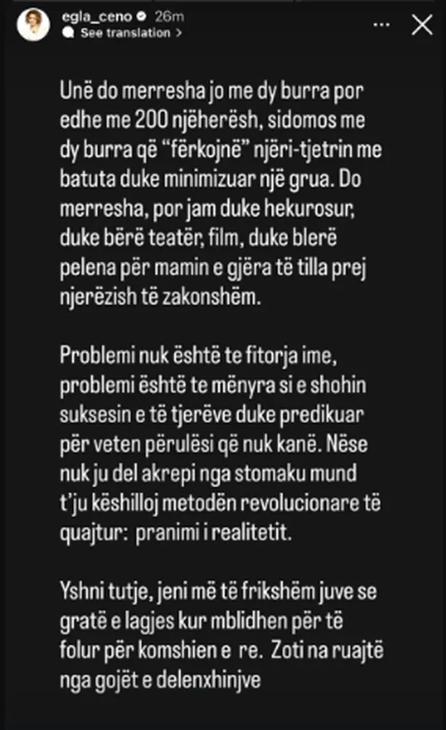 Reagimi i Egla Cenos ishte i menjëhershëm dhe i drejtpërdrejtë. Ajo shprehu se do merrej me dy burra, madje edhe me 200, por aktualisht është e angazhuar me aktivitete të zakonshme të jetës. Kjo e bën të qartë se ajo nuk dëshiron të minimizohet nga batutat e dy burrave.