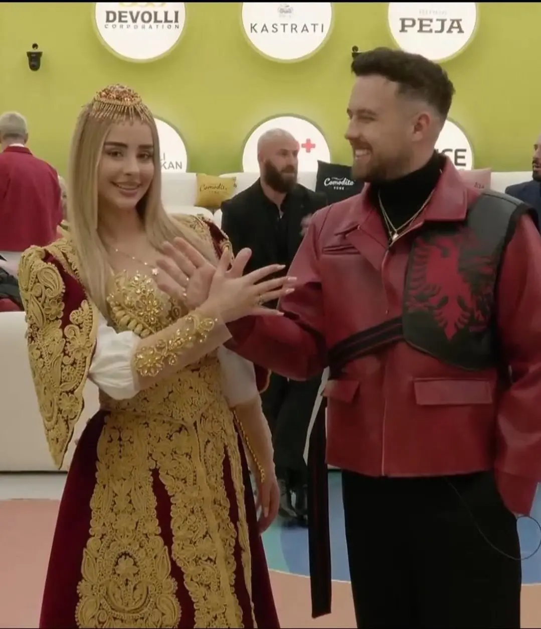 E veshur me një kostum tradicional shqiptar, ajo shkëlqen, duke sjellë një ndjesi krenarie dhe lidhjeje me rrënjët kulturore.