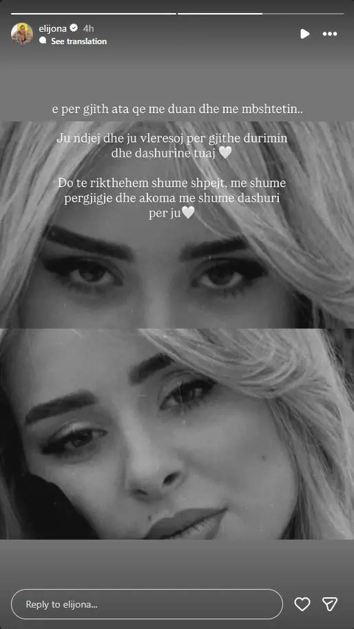 Me një postim në InstaStory, Elijona ka shprehur mirënjohjen e saj për mbështetje dhe dashuri që ka marrë nga ndjekësit. Ajo thekson se ndjen një lidhje të veçantë me ata që e kanë mbështetur dhe se kjo është arsyeja pse ajo ka vendosur të rikthehet.