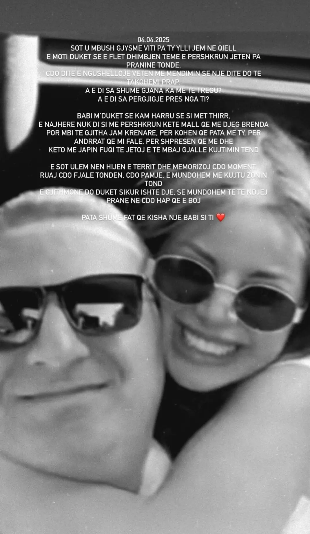 “Sot u mbush gjysmë viti pa ty, ylli jem në qiell. E moti duket se e flet dhimbjen time, e përshkruan jetën pa praninë tënde. Çdo ditë e ngushëlloj veten me mendimin se një ditë do të takohemi prap,” shkruan ajo, duke shprehur një ndjenjë të thellë humbjeje.