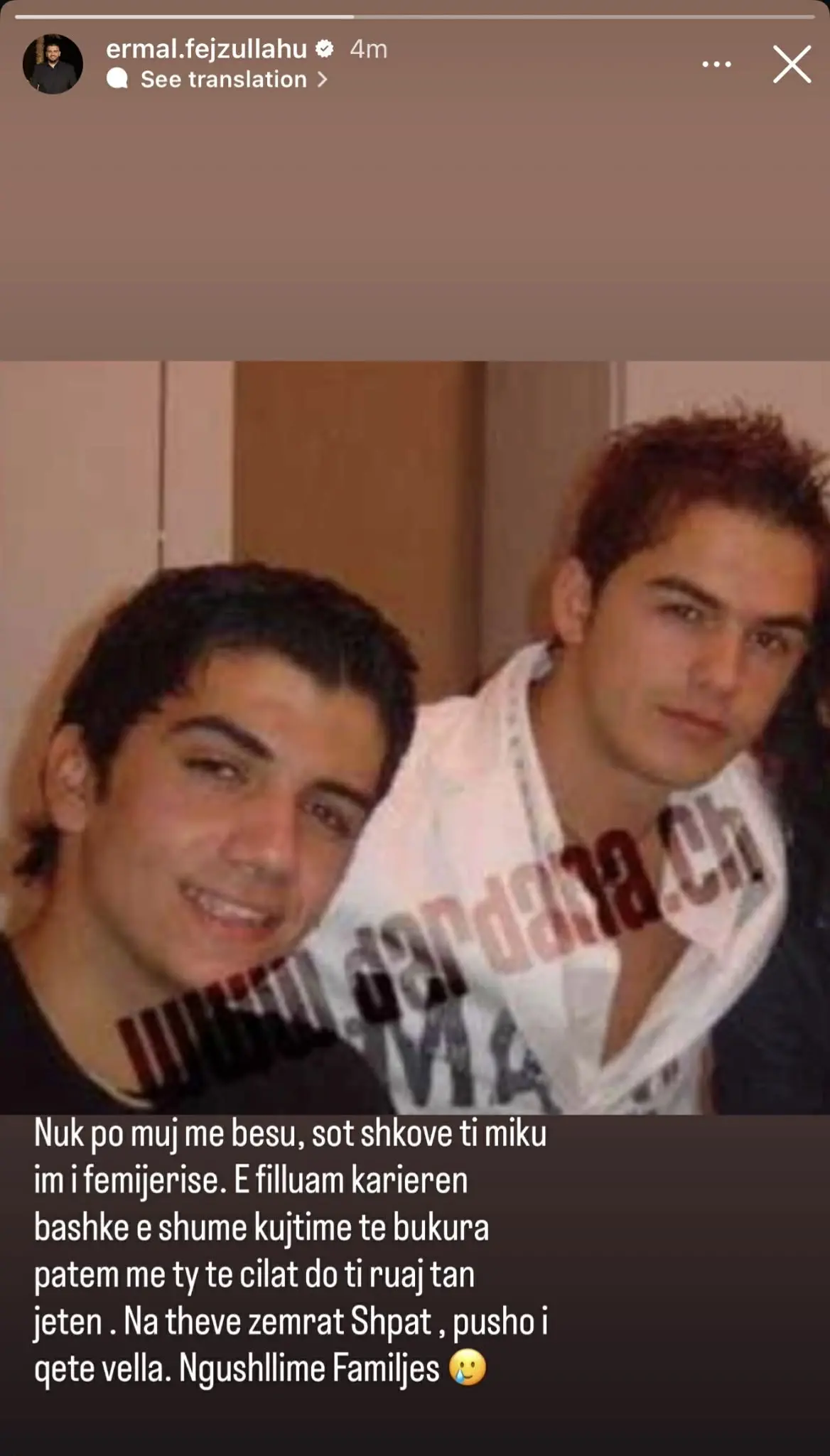 “Nuk po muj me besu, sot shkove ti miku im i fëmijërisë. E filluam karrierën bashkë e shumë kujtime të bukura patëm me ty të cilat do t’i ruaj tërë jetën. Na theve zemrat Shpat, pusho i qetë vëlla”, ka shkruar Fejzullahu në postimin e tij, duke shprehur dhimbjen e thellë që ndjen për humbjen e mikut të tij.