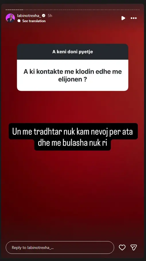 Një nga pyetjet që iu bë ishte për Klodin dhe Elijonën, ku Labi shprehu një qëndrim të qartë: “Unë me tradhtar nuk kam nevojë për ata dhe me bulasha nuk rri”.