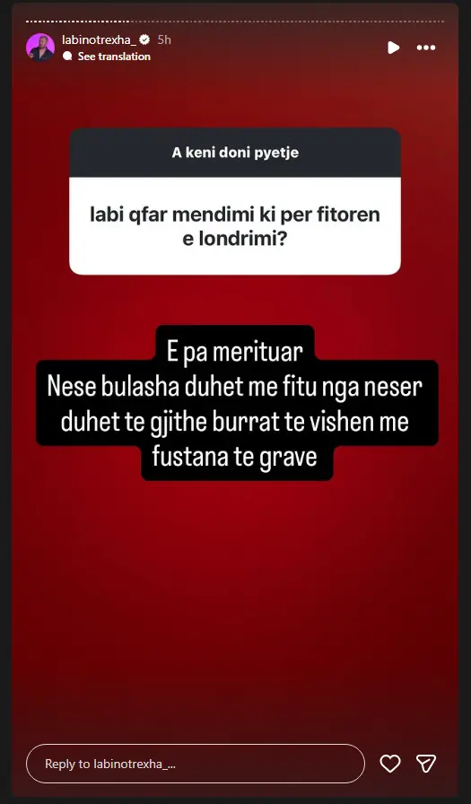 Këngëtari Labinot Rexha, i njohur ndryshe si Eskalon Labi, ka hapur një pyetësor në Instagram që ka shkaktuar shumë reagime.