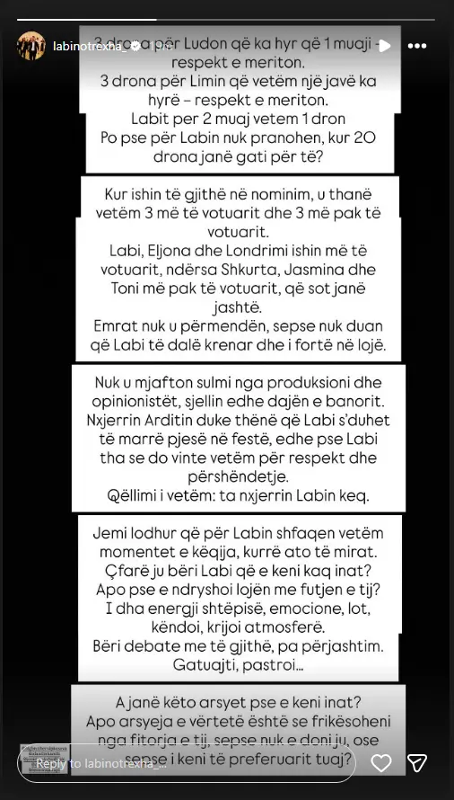 Reagimi i tyre ka ardhur pas një periudhe të gjatë në të cilën Labinot ka kontribuar në lojë, por sipas familjarëve, vlerësimi që ai po merr është shumë i ulët në krahasim me përpjekjet e tij.