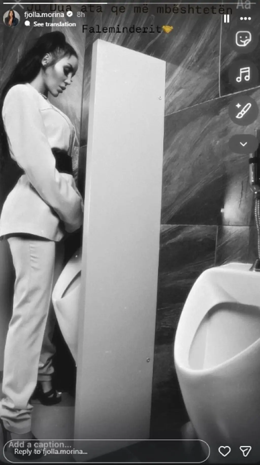 Ajo publikoi një fotografi të pazakontë dhe ironike, ku shfaqet në tualetin e meshkujve, duke improvizuar sikur po urinonte, një imazh që u interpretua nga ndjekësit si një mesazh i drejtpërdrejtë dhe provokues ndaj situatave që kishte kaluar.