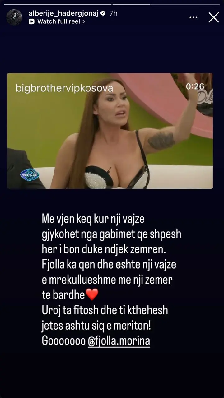 Këngëtarja e njohur, Albërie Hadërgjonaj, ka shprehur publikisht mbështetjen e saj për banoren e Big Brother VIP Kosova, Fjolla Morina, përmes një postimi në rrjetet sociale.