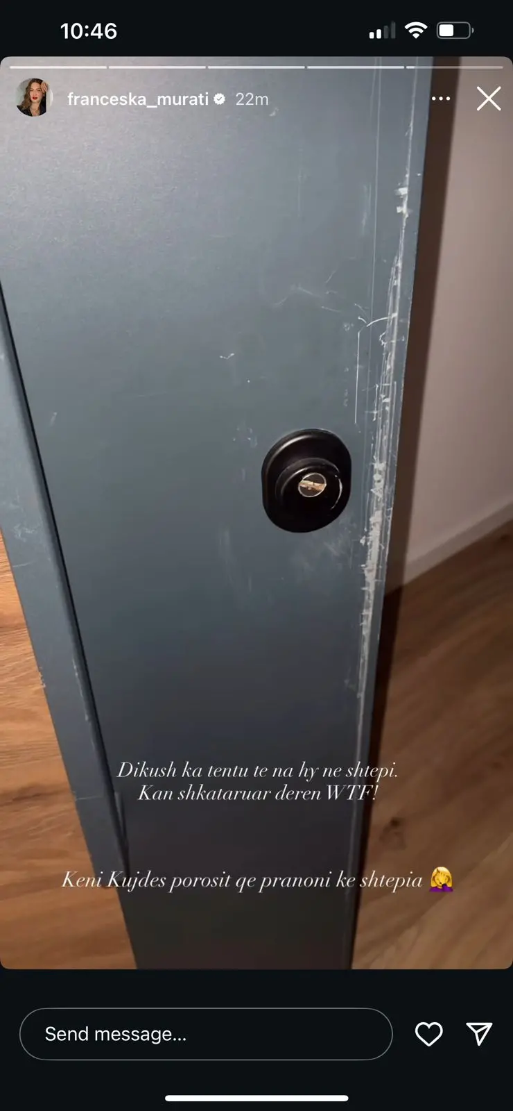 “Dikush ka tentou të na hy në shtëpi. Kanë shkatërruar derën. WTF! Keni kujdes porositë që pranoni në shtëpi,” ka shkruar Franceska në postimin e saj, duke shprehur shqetësimin e saj dhe duke paralajmëruar ndjekësit e saj për kujdesin e nevojshëm.