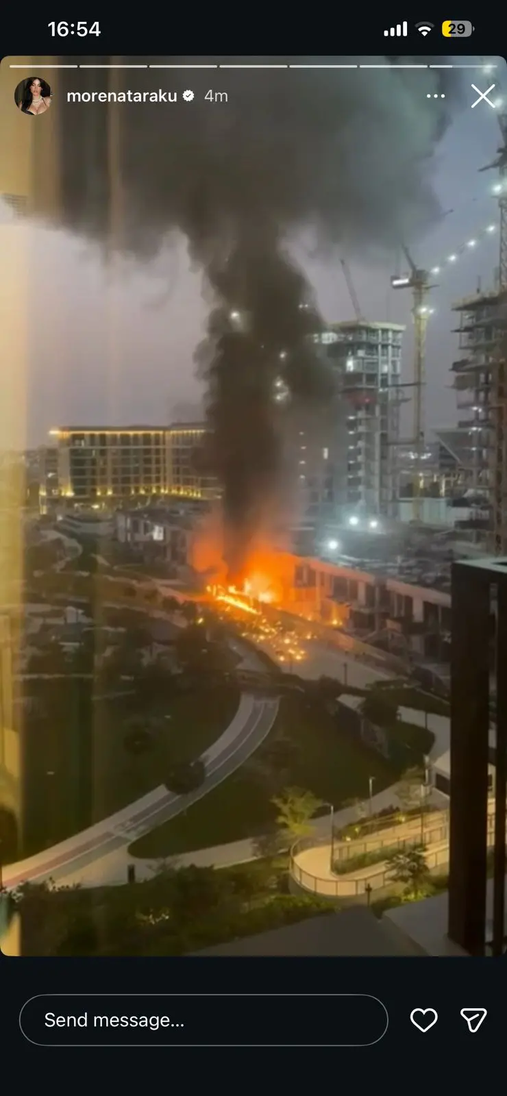 Në një video të publikuar në llogarinë e saj në Instagram, Morena tregon një shtëllungë të madhe tymi dhe zjarri që ndodhet vetëm pak metra larg shtëpisë së saj. Kjo situatë dramatike është rezultat i rënies së mbetjeve nga dronët e interceptuar, duke sjellë shqetësim të madh për të dhe për ata që jetojnë në Dubai.