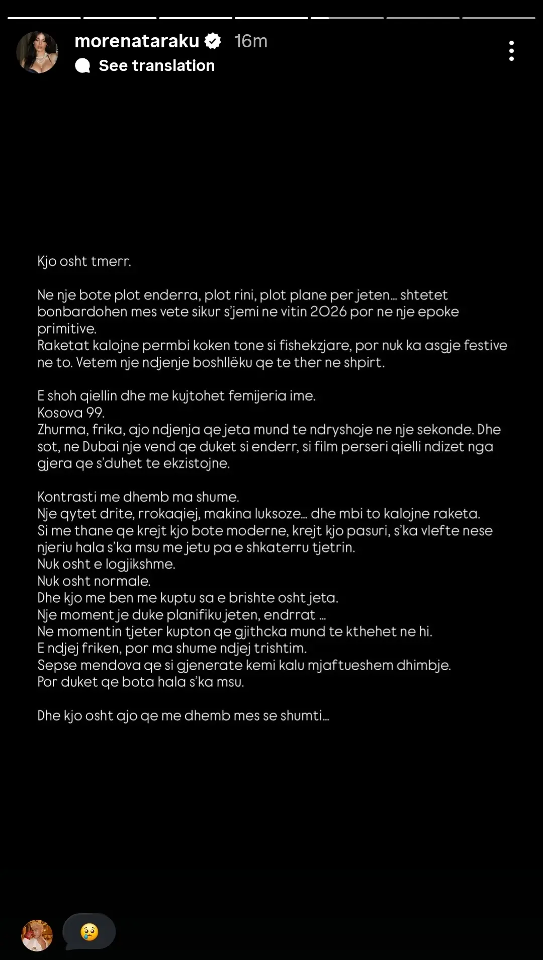 Artistes i është rikthyer frika e luftës, duke përmendur kujtimet e errëta nga konflikti i Kosovës në vitin 1999. Ajo shprehu trishtimin e saj përmes një shkrimi të gjatë, duke theksuar se ndjenja e sigurisë mund të zhduket në një çast, duke lënë pas një realitet të frikshëm.