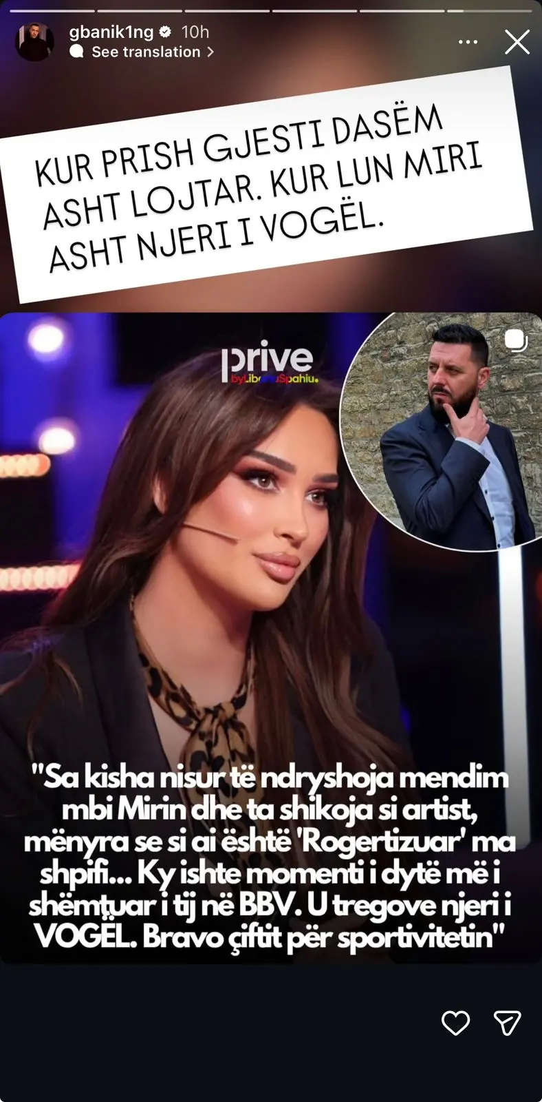 “Sa kisha nisur të ndryshoja mendim mbi Mirin dhe ta shikoja si artist, mënyra se si ai është ‘Rogertizuar’ ma shpifi… Ky ishte momenti i dytë më i shëmtuar i tij në BBV. U tregove njeri i vogël. Bravo çiftit për sportivitetin.”