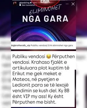 G Bani reagon ashpër ndaj eliminimit të Erikut