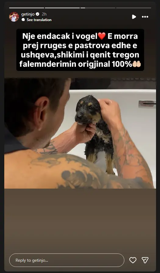 “Një endacak i vogël E mora prej rrugës, e pastrova edhe e ushqeva. Shikimi i qenit tregon falënderimin origjinal 100%”, shkruan Getinjo, duke e bërë këtë moment edhe më emocionues.