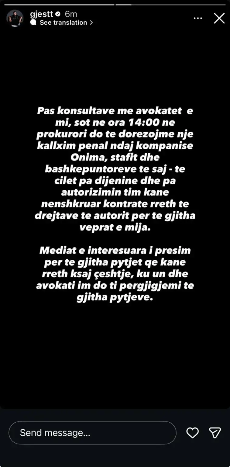 Një ngjarje e rëndësishme po zhvillohet në botën e muzikës, ku këngëtari Gjesti ka njoftuar se do të ndërmarrë hapa ligjorë ndaj kompanisë Onima.